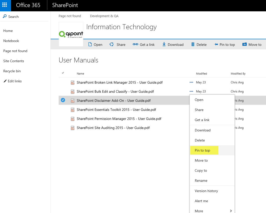- Pin to Top – This option allows users to pin a document or folder to the top of the list, above ll the items (see screenshot below)